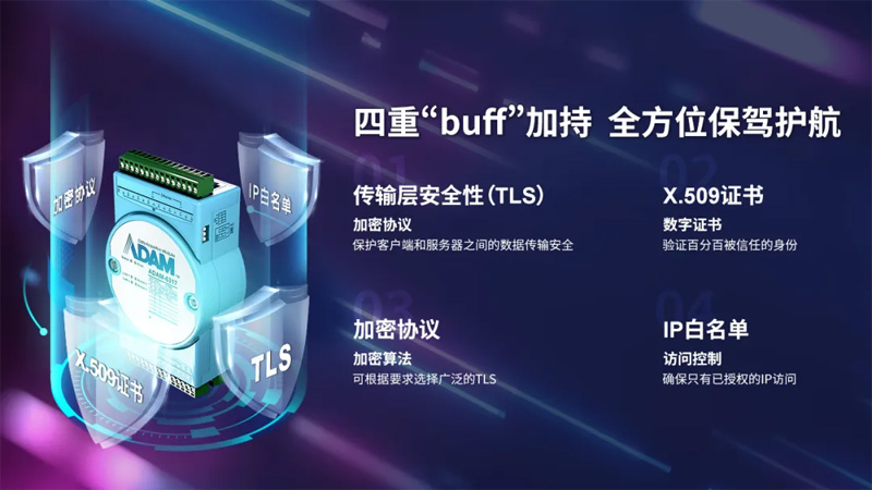 為解決客戶這一顧慮,實現數據的安全和隱私保護,研華Cloud I/O ADAM-6000/6200采取了一系列的安全措施:TLS、X.509證書、加密協議、IP白名單,筑起數據安全的“防火墻”