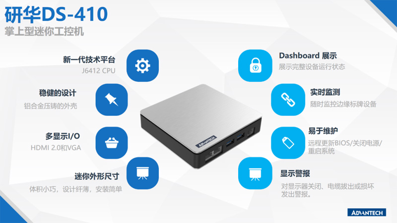 DS-410是一款小巧而強大的設備,突破了Mini PC的標簽。其緊湊的26毫米厚度的框架可以適用于單個或雙面中小型顯示器支架。這些顯示設置對于即時信息傳遞和指導至關重要,在旅客通關或是在中島航空區域和海關關口為游客提供指導。