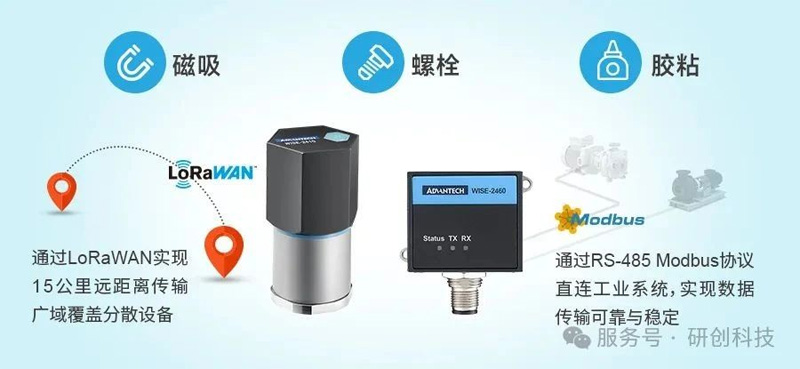 通過磁吸/螺栓/膠粘等方式,安裝時間壓縮,徹底告別復雜布線。WISE-2410憑借LoRaWAN實現15公里超遠傳輸與建筑穿透,廣域覆蓋分散設備;WISE-2460通過RS-485 Modbus協議直連工業系統。二者經WISE-6610網關可無縫融入SCADA現有工業系統,減少IT基礎設施投入。
